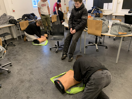 Eleverne på Forsvar & Beredskab-linjen har haft en intens og lærerig dag med fokus på førstehjælp. De har finpudset deres færdigheder i hjertelungeredning (HLR) og brug af AED (hjertestarter) – kompetencer, der kan redde liv.