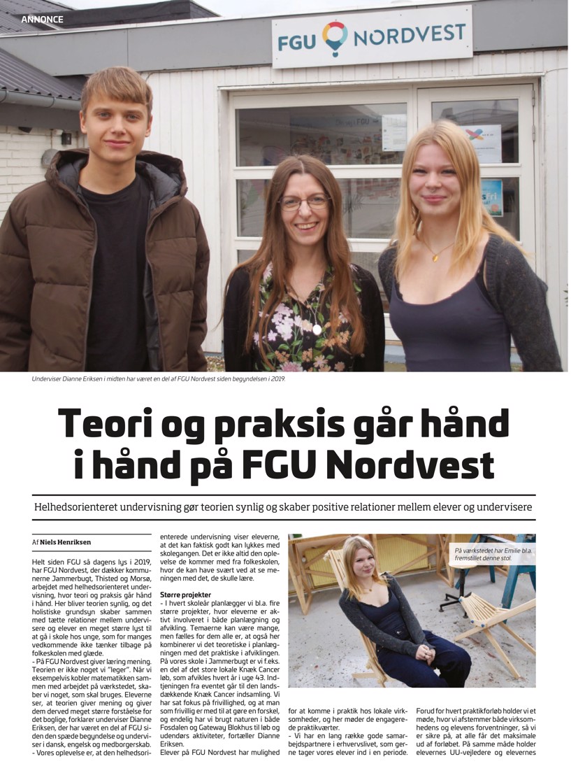 Nordjyske Mediehus har for nylig bragt en artikelannonce om FGU Nordvest i deres uddannelsestillæg med overskriften “Teori og praksis går hånd i hånd på FGU Nordvest”.